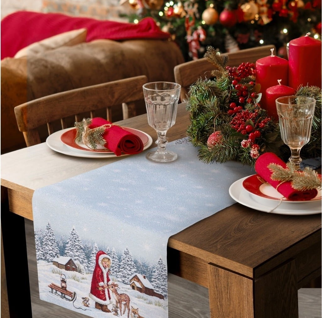 Szukasz wzorów, które pięknie zaprezentują się w stylizowanym wnętrzu? Bieżnik gobelinowy wykonany z grubej tkaniny ozdobiony wzorem kwitnących kwiatów inspirowany stylem folk, to dekoracja dodająca stylu wnętrzu. Grubsza żakardowa tkanina gwarantuje piękny efekt dekoracyjny, a uzyskany techniką tkania wzór sprawia, że obrus pięknie się prezentuje zarówno we wnętrzu w stylu rustykalnym, jak i w nowoczesnej stylizacji retro czy folk. Wysoka jakość oraz staranne wykonanie gwarantują satysfakcję z produktu, a motyw zimowy znakomicie ożywia wnętrze, wprowadzając do aranżacji świeżość i radosny świąteczny nastrój.