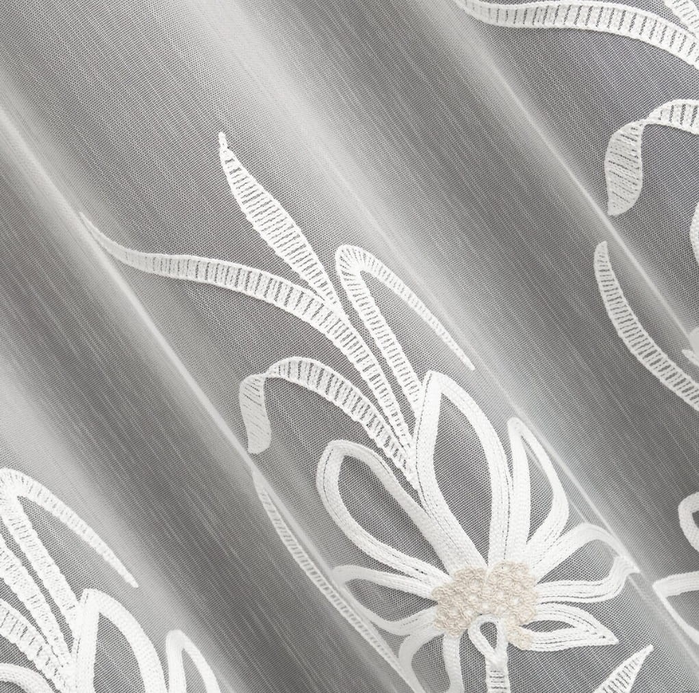 Wzór: subtelny haft kwiatowy Wykończenie dolne: ozdobna fala Doskonała przepuszczalność światła Łatwa w pielęgnacji – możliwość prania w pralce w 30 stopniach z lekkim wirowaniem max 400obr.