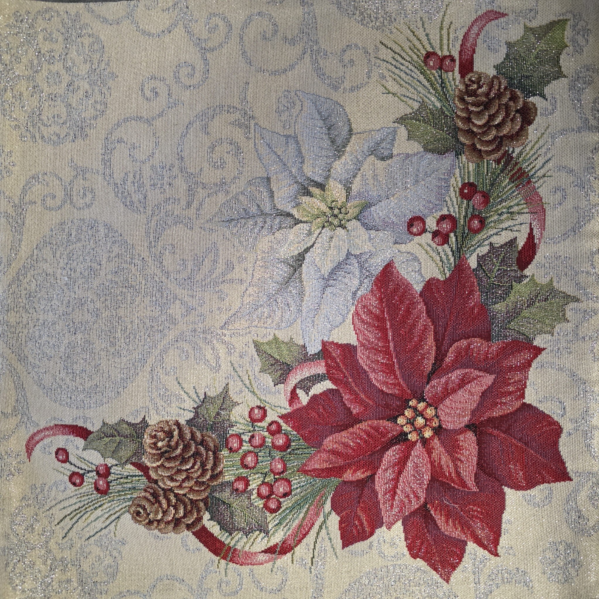 poszewka na poduszkę z gobelinu z tego samego wzoru dostępne serwety, bieżniki i obrus