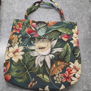 Pojemna torba wykonana z ozdobnej tkaniny.
