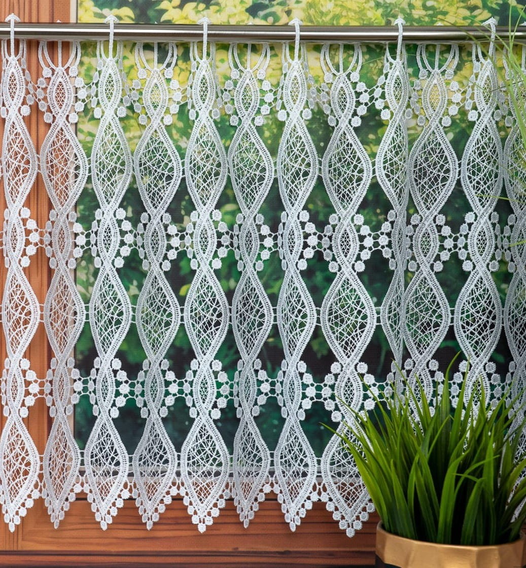 Tkanina firanowa o ażurowej strukturze to dodatek, który sprawdza się zarówno w klasycznych, jak i nowoczesnych wnętrzach. Niezwykle elegancka gipiura o grubym wzorze doskonale prezentuje się jako samodzielna dekoracja okienna.
